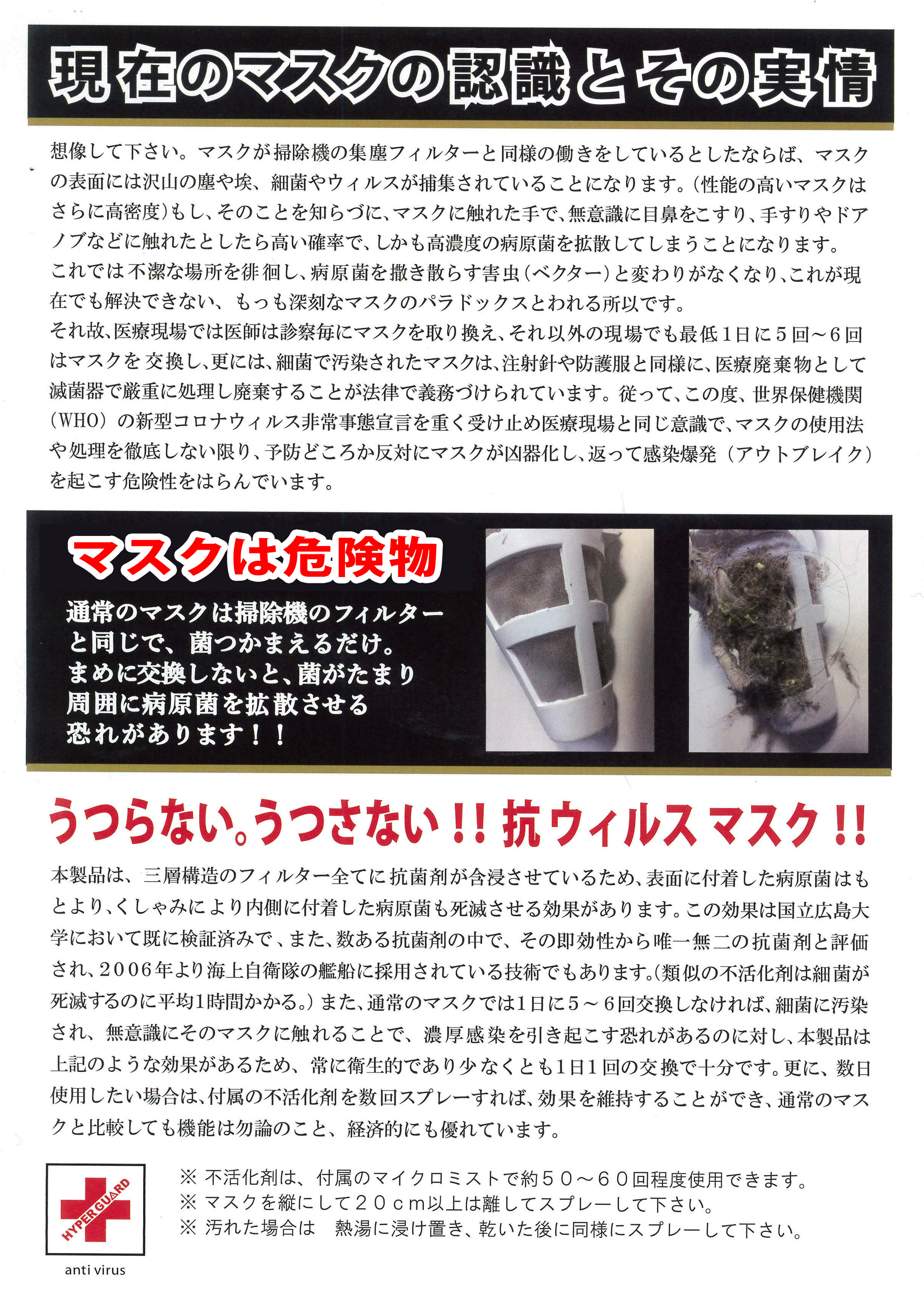 不活化マスクに、このハイパーガードマスターを1日に数回スプレーする事で3日間は使用できます。